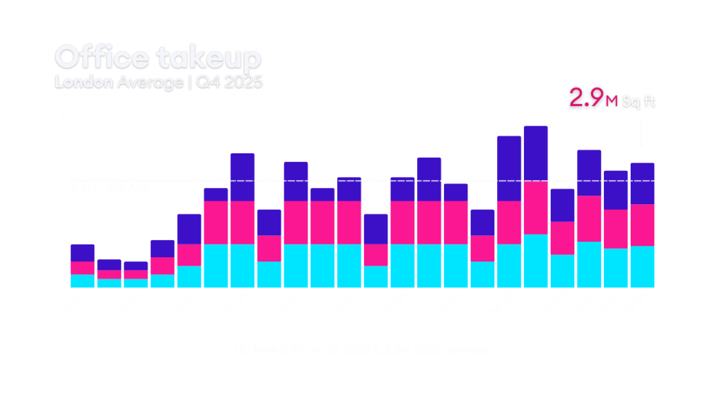 Central London office take-up rebounded strongly in Q4 2025, marking a decisive improvement on Q3 activity. Leasing volumes reached 2.9m sq ft, exceeding the long-term quarterly average and signalling businesses committing to their new space.