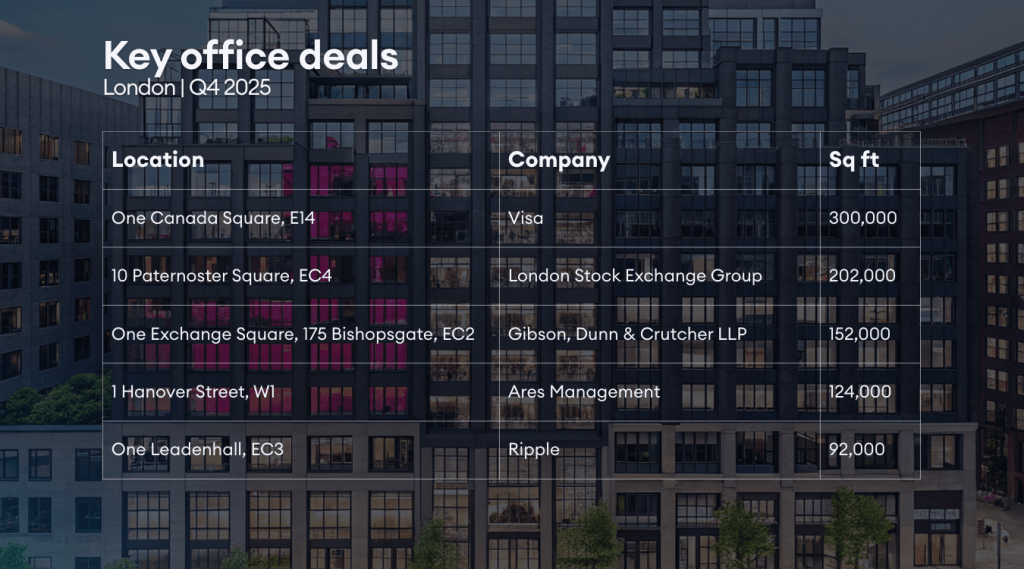 Taken together, the largest Q4 2025 office deals underline how occupiers are deploying space selectively across distinct submarkets rather than converging on a single “best” location.
