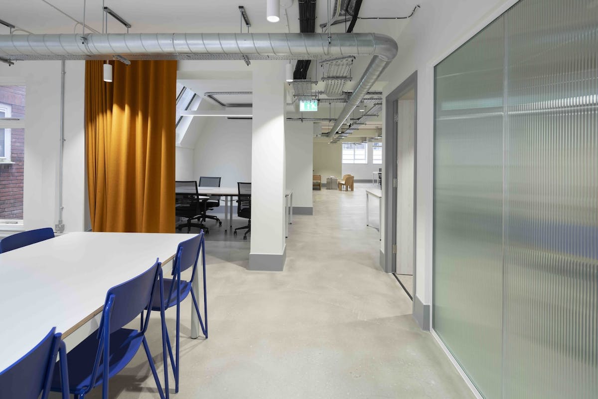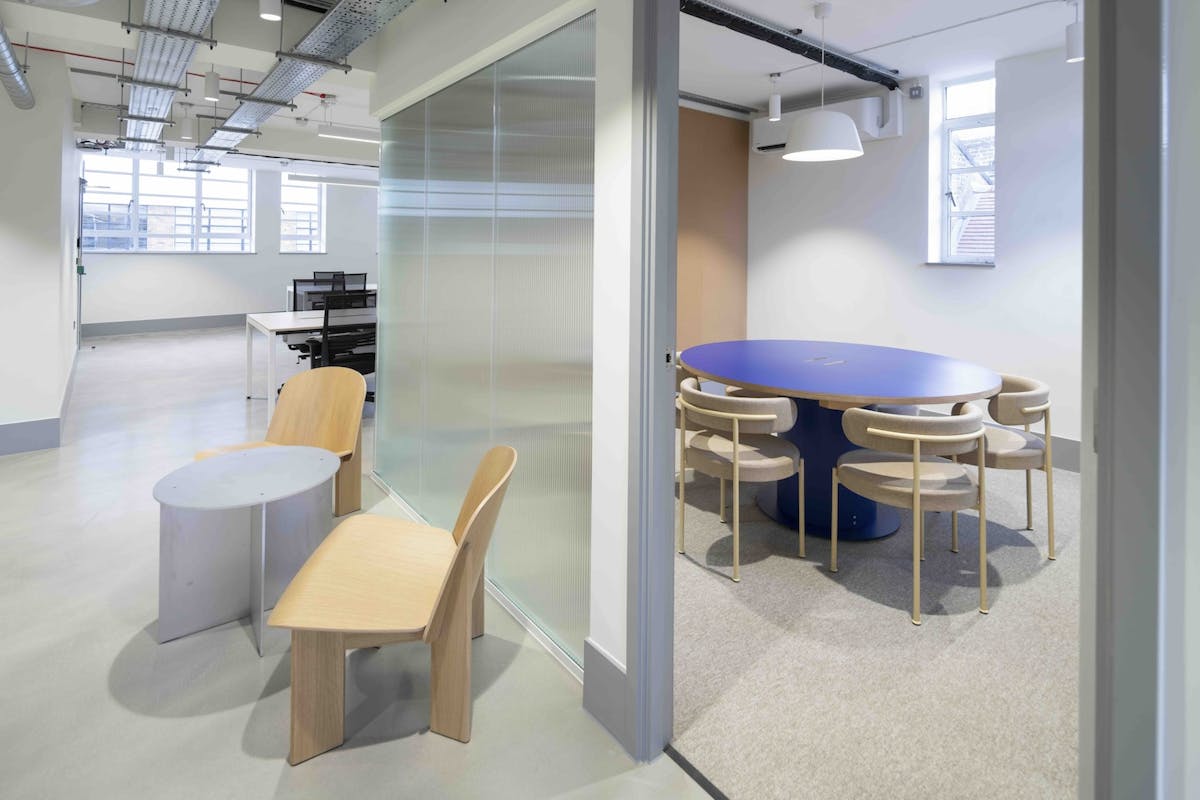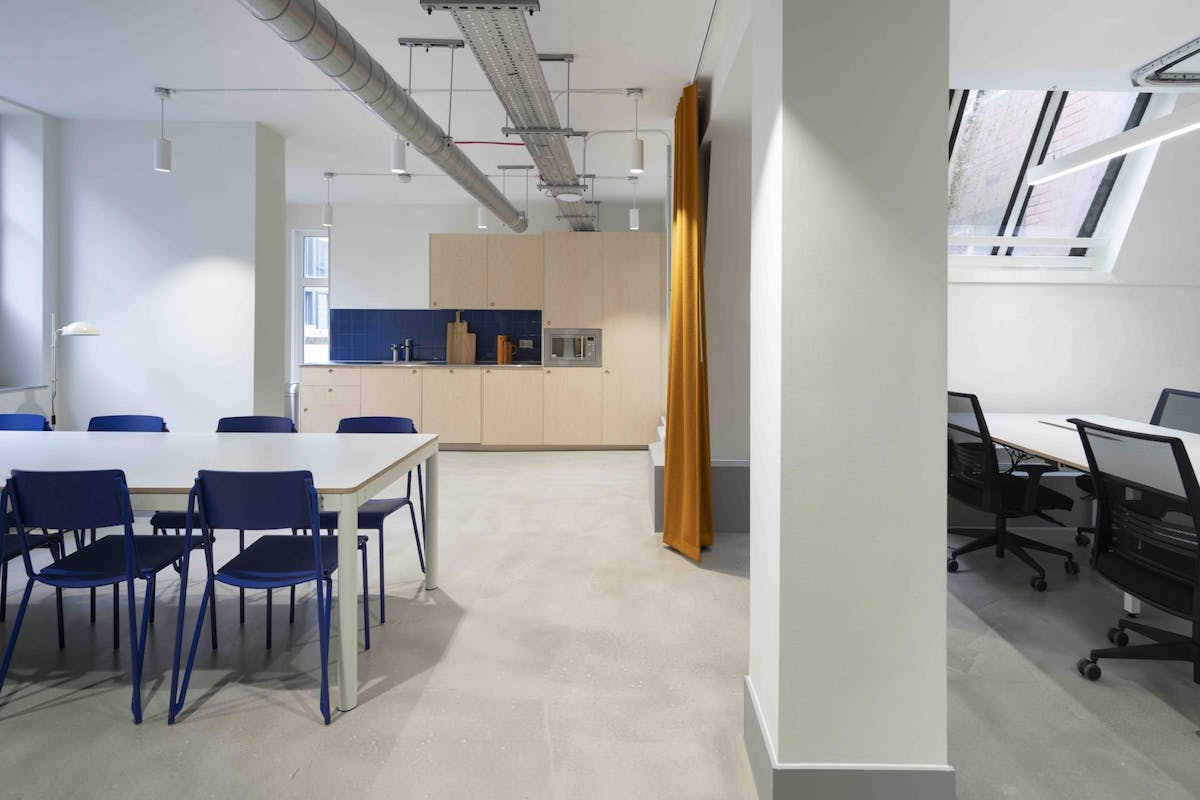 Each studio features a distinctive long, narrow layout that naturally divides into separate working zones—perfect for balancing focus, collaboration, and relaxation. Expect private meeting rooms, rear-facing kitchens, breakout areas, and direct lift access into each studio. The interiors combine industrial charm with natural materials and vibrant touches, creating a clean, modern environment that’s easily customised to suit your brand.