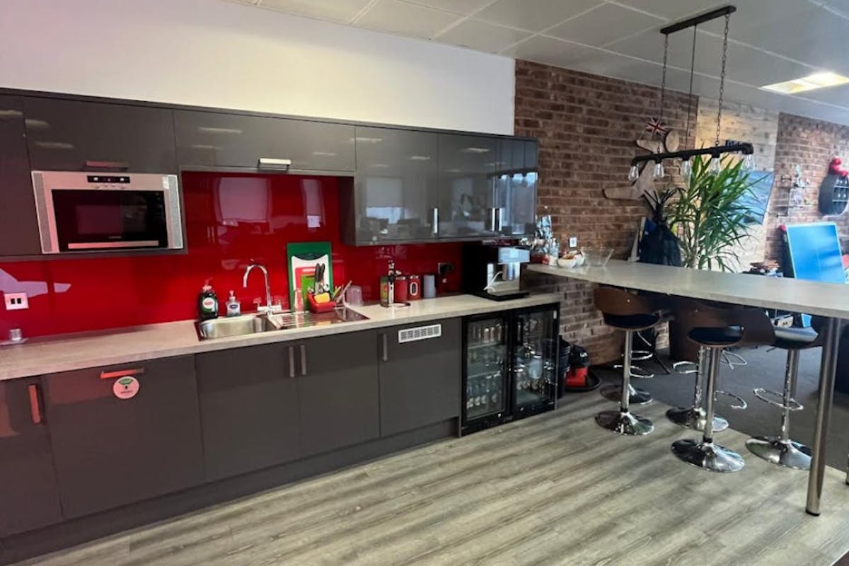 The layout has been carefully designed to balance productivity and collaboration, featuring an integrated meeting room with a TV for seamless video conferencing, a contemporary kitchen with a breakfast bar, and breakout areas for informal meetings.