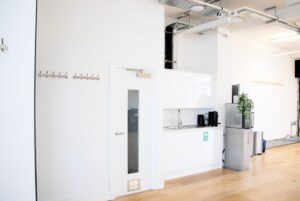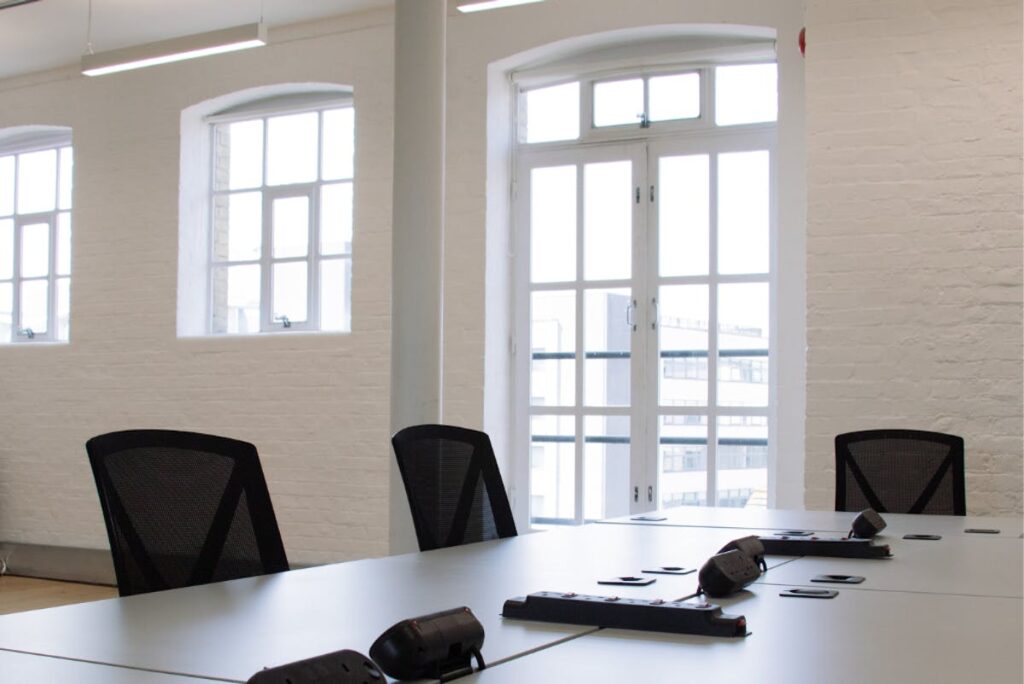 This fifth-floor unit is currently available, offering 1,285 Sq ft with high ceilings, arched windows, excellent natural light and brick walls to frame the open floor plan. It features a private meeting room and WC, ample breakout space, and a kitchenette, all accessible by a passenger lift.