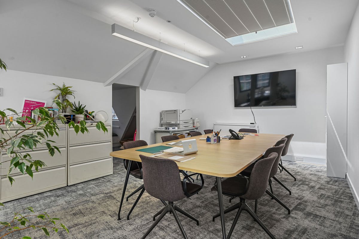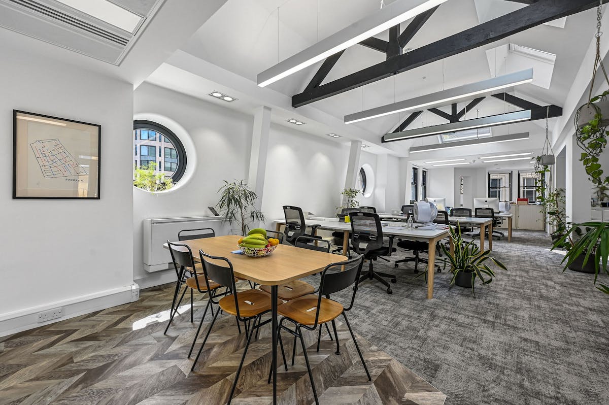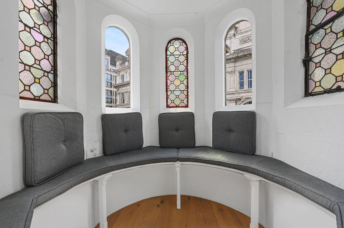 The striking top floor showcases a stunning pitched roof with exposed beams and a distinctive turret-style room offering panoramic views of St Paul’s Cathedral, perfect for executive space or impressive client meetings.